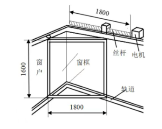 该窗结构由窗框、窗户、轨道、丝杆、电机组成。窗框尺寸为1800×1600,窗户安装于窗框内。轨道设置在阳台上下侧,供窗户移动。电机与丝杆联动,电机驱动丝杆运转,带动窗户沿轨道滑动,实现开窗、关窗动作,满足开关窗的自动化需求,结构设计紧凑,传动逻辑清晰,可有效实现窗户的稳定驱动