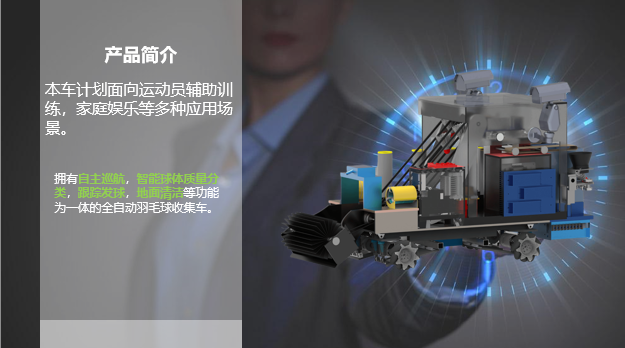 拥有自主巡航,智能球体质量分类,跟踪发球训练,地面清洁等多种功能为一体的全自动羽毛球收集车,实现一机多用的新理念。