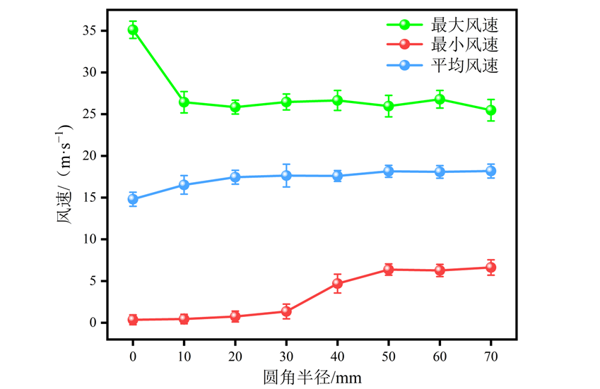 在弧形出风口的设计中,增大风筒与环状出风口结合处的圆角半径可以减小流体的转向角,使得气流在拐角处的流动更为流畅,从而减小了能量损失与湍流产生,增大了出风口的平均风速,提升风速在出风口处分布的均匀性。