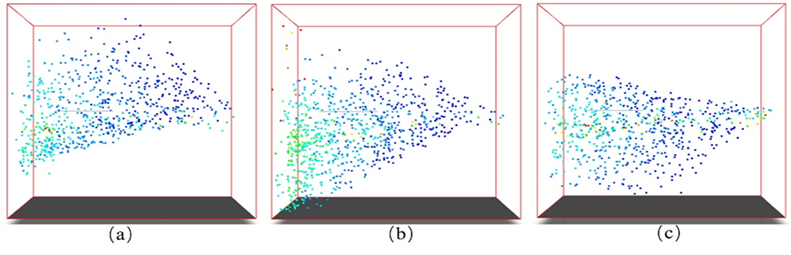 图 b 是喷头水平喷射的过程,在这个过程中,大部分雾滴粒子由于自身重力作用落于椭圆形捕捉域的正面,在气流的携带下,椭圆形捕捉域的背面也有部分粒子落下。值得注意的是,这个过程要区分由上到下还是由下到上,在由下到上的过程中,此刻虽然是水平喷射,但是雾滴由于惯性会带有向上的初始速度,这会导致椭圆形捕捉域 的背面雾滴增加。在由上到下的过程中,雾滴带有向下的初速度,这种状态也会导致也椭圆形捕捉域的正面雾滴覆盖率增加。图 c 是喷头由上向下喷射的过程,这个过程相比图b,会有更多的粒子冲击椭圆形捕捉域的正面,增加其表面的雾滴覆盖率,但椭圆形捕捉域背面由于雾滴初始速度方向的问题,这个过程背面捕捉到的粒子较少。