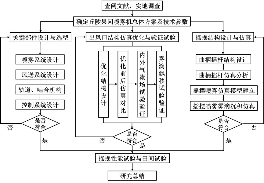 根据果树管理的植保农艺要求,结合计算机数值模拟仿真技术,研制一款丘陵果园单轨遥控喷雾机,对其风送系统及关键部件进行优化设计与田间试验。总体设计方案如下:
