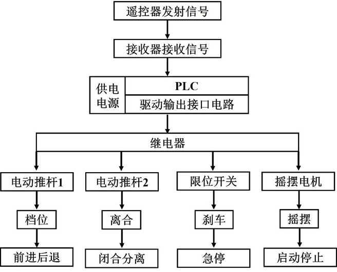 控制装置主要由控制箱与电动推杆构成,电动推杆连接控制轨道车的进退与启停。 控制箱内装有 PLC 及继电器,通过控制继电器的通断,实现电动推杆的伸缩与喷头的 摇摆喷雾。利用信号收发器,实现远程遥控。弥雾机左右各四个喷头携带独立开关, 根据果树种植高度及密集性,可控制喷雾角度和喷雾量。控制系统流程如图:
