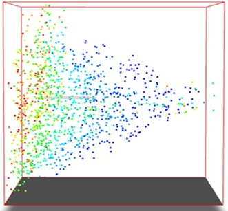 静止喷雾不同时刻的仿真过程如下图所示。从图中可以看出,这个过程是喷头水平喷射的过程,雾滴以水平初速度冲击椭圆形捕捉域,由于自身重力的影响,椭圆形捕捉域正面落下的雾滴粒子要高于背面,它与摇摆喷雾的水平喷雾有所不同,雾滴没有向上或者向下的初始速度。