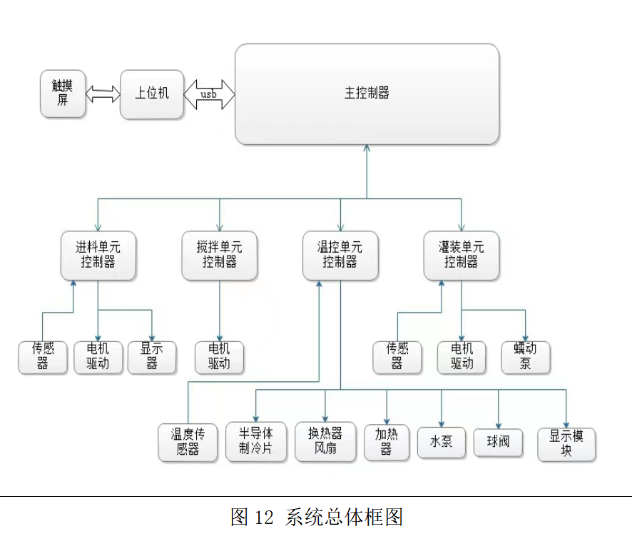 本设计是基于STM32的智能发酵奶茶机,能够自动制作发酵奶茶并进行灌装销售。系统通过进料单元自动进料,以避免人工干预,实现系统的连续运行。智能化发酵饮品售卖机主要由发酵系统、灌装系统、支付系统和发酵配方这四部分构成,通过搅拌单元实现对罐体的搅拌和清洗功;控制部分主要由传感器、传感器采集电路、半导体制冷片、温度控制器、多相时序控制器和上位机软件等组成,通过温控单元进行灭菌,发酵和冷藏,以保证发酵质量和食用安全;其工作原理为:上位机控制微控制器发送电压激励信号,微控制器控制传感器采集电路进行模拟量采集,经过微控制器模数转换对执行器发送电压激励信号进行控制,经过多次信息交互,执行器(半导体制冷片、气力输送器、搅拌扇叶、步进电机)依次运作实现产品生产、包装、输送。其发酵饮品售卖机的系统和结构如图所示。