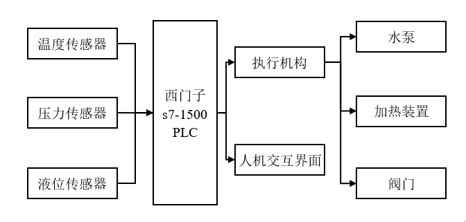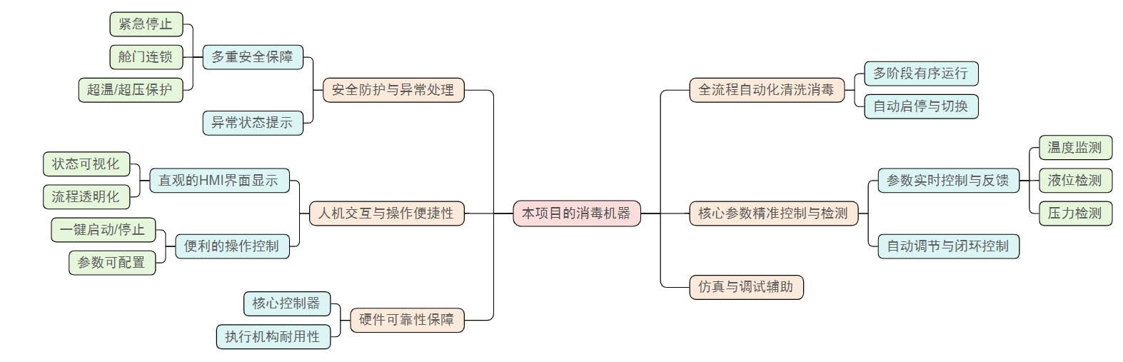 根据小荷医典数据显示:手术器械消毒不彻底等因素占手术部位感染因素的30%~40%,而手术器械和操作进行规范消毒后,手术部位感染的发生率仅为1%~3%,由此可见医用消毒在手术成功与否中起到了至关重要的地位。本团队针对医用器械消毒来对医用清洗消毒机的工作流程进行了详细分析,明确了控制系统的功能需求和性能需求,进而设计了一款医用清洗消毒机,它是以S7-1200系列PLC为控制核心,通过团队制定设计指标参数和流程图,编写PLC控制程序,明确内部寄存器及I/O配置等来与多种传感器及加热装置进行关联,同时通过HMI界面实现人机交互,通过HMI界面来控制系统的运行来达到医用器械消毒的效果。本产品集成了以PLC为核心的控制系统,能够实现对医疗器械清洗、消毒、干燥全流程的自动化、高精度控制。结合传感器实时监测与执行机构精准动作,确保医疗器械在预洗、清洗、中和、冲洗、漂洗、干燥等阶段均达到标准化处理要求,最终实现医疗器械的高效、安全消毒,满足现代医疗行业对清洗消毒质量的严苛需求。其控制系统总体框架如下图1所示,主要功能如图2所示。