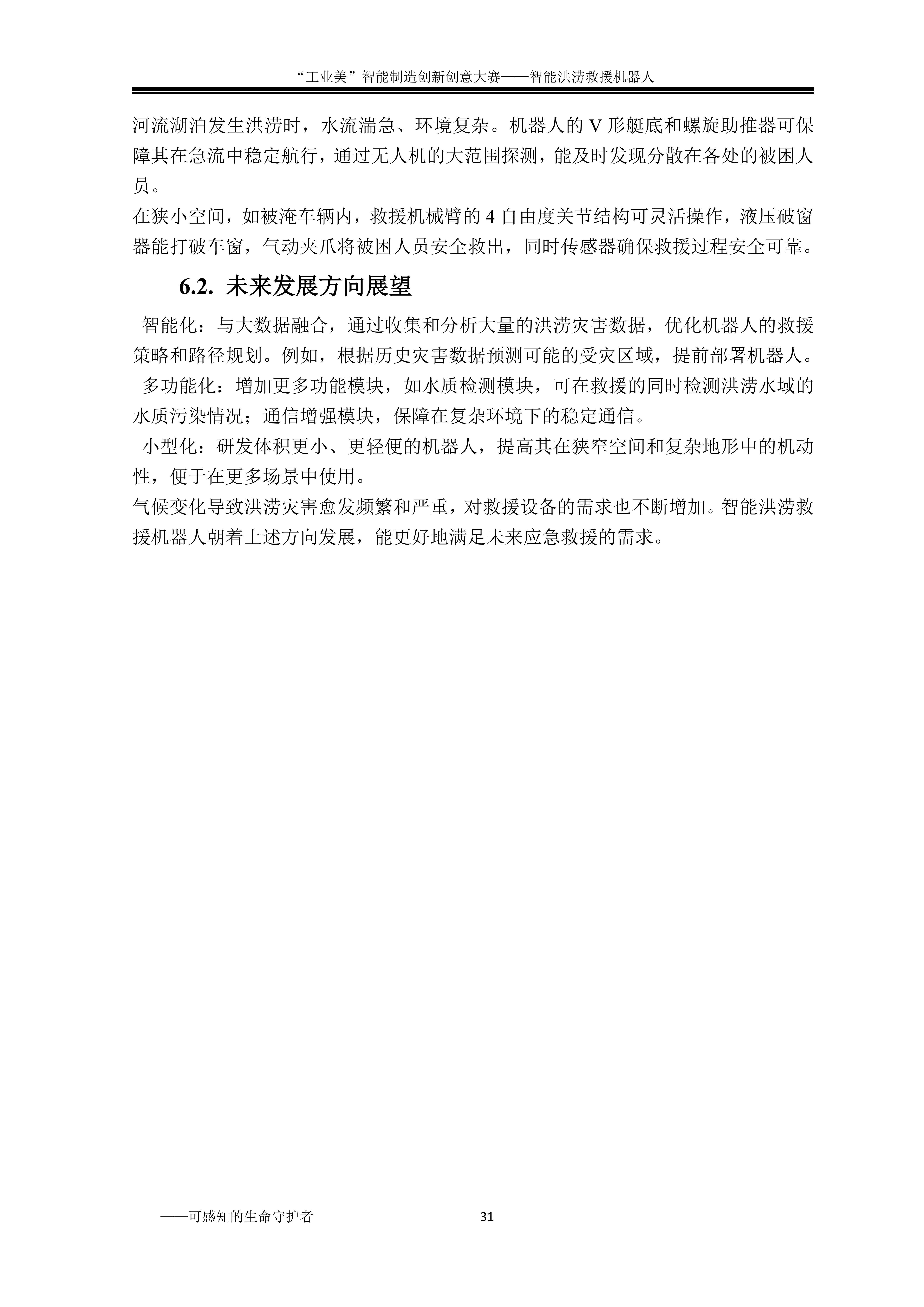 作品名称:“可感知的生命守护者”智能洪涝救援机器人 学校名称:南昌交通学院 参赛队伍:小小 队伍编号:211048 参赛学生:朱宇韩 王庆俊 傅诚惟 安仪聪 指导老师:陈紫微 温鑫 投票日期:2025年10月10日 00:00->2025年12月15日 00:00 请在微信端进行投票。点此扫描二维码。