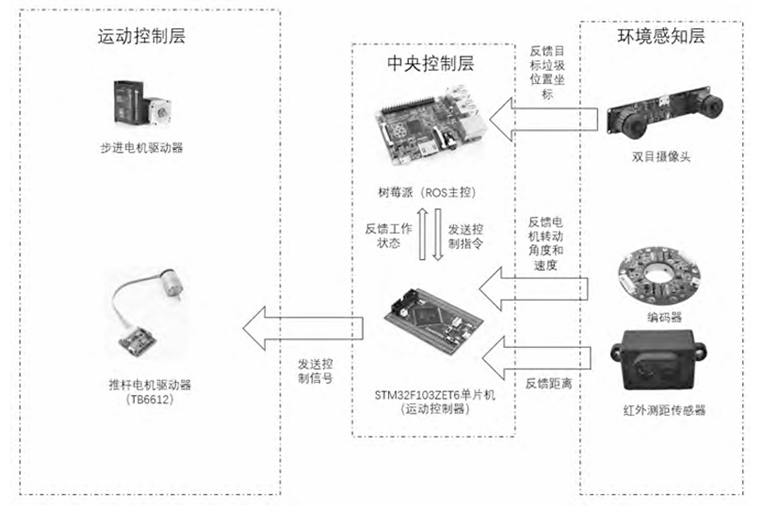 该系统的硬件系统主要由垃圾分拣装置、双目相机、树莓派等组成,硬件系统框架如图17所示。软件系统框架如图18所示。双目相机实时拍取混合垃圾箱的图像并发送给树莓派,通过部署在ROS主控的YOLOv5s目标检测算法识别目标垃圾并获取目标垃圾在相机坐标系的三维位置信息,利用TF包将相对摄像头的坐标信息转化为在世界坐标系的三维坐标信息,随后向STM32F103ZET6单片机发送机械臂垃圾储存箱中步进电机转动角度和速度的控制指令,使机械臂运动至目标垃圾上方,随后对目标垃圾进行抓取并放至对应种类垃圾收集箱。