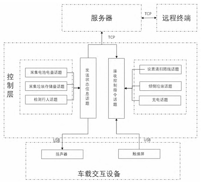 软件系统框架图如图20所示。通过车载触摸屏向小车设置清扫路线等控制指令并查看小车剩余电量、垃圾存储情况等信息,在遇行人干扰时,可通过扬声器提醒行人注意避让。同时借助服务器作为数据和控制指令中转站,电脑等远程终端通过TCP通信协议与小车发送控制指令和查看小车状态信息。