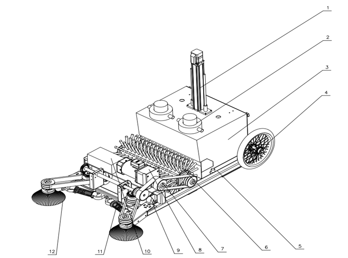 1——垃圾分拣总成 2——风机 3——垃圾储存箱 4——后轮 5——机架 6——滚刷 7——带轮 8——V带 9——电机 10——电池 11——铰链 12——盘刷