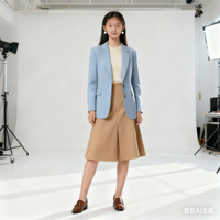 浅卡其色休闲西装套装,内搭燕麦色针织打底(替换传统衬衫更显柔和),下装搭配微喇西装裤修饰腿型。面料采用轻薄棉麻混纺,透气不闷汗,适合商务洽谈、实习办公等多场景。腰间可拆卸宽腰带提升腰线,配饰选用极简银色细项链与低跟乐福鞋,打造“不费力的专业感”,适配大学生从校园到职场的过渡。
