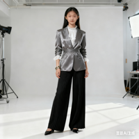 以雾霾蓝挺括西装为核心,搭配米白色垂感衬衫与浅灰九分西裤,面料选用抗皱透气的聚酯纤维混纺,适配大学生初入职场的通勤场景。利落翻领+隐形纽扣设计弱化严肃感,袖口撞色刺绣暗藏青春细节,既符合职场着装规范,又不失年轻群体的灵动气质,平衡专业与亲和力。