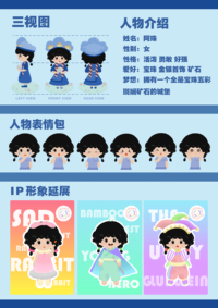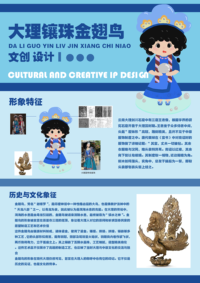 本设计以大理文化瑰宝——镶珠金翅鸟为灵感源泉进行创作。金翅鸟在大理文化中具有独特且重要的地位,它是大理佛教文化与本土神话融合的象征,代表着守护与力量。主人公阿珠,取“镶珠”谐音。其形象设计融合大理传统服饰元素与现代审美。服饰色彩选用大理传统蓝,搭配精致配饰,呼应金翅鸟的华丽高贵。发型设计独特,发饰造型源于金翅鸟的羽翼与珠宝装饰,彰显地域文化特色。