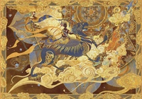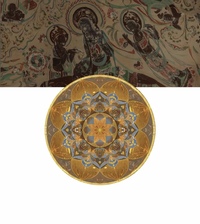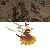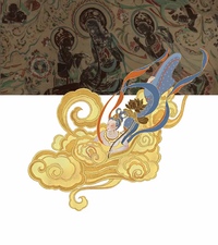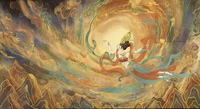 这组作品以敦煌壁画为精神内核,从“舞乐飞天”“乘虎飞天”“持花飞天”等经典窟绘意象中提取元素:暖焰流云裹挟的舞袖飞天、踏金云而行的乘虎瑞兽、执光捧珠的童子、持莲曳带的飞仙、弦萦莲座的乐舞身姿,以及复刻窟顶宝相纹的金莲藻井,将盛唐壁绘的秾丽色彩、丝路纹样的交融气质与“刚柔并济”的民族美学凝于画面。从飞天衣袂的鎏金纹饰到童子手中的曜珠,从琵琶弦声里的乐舞韵律到藻井纹样的几何图腾,每一处细节既是敦煌艺术千年神韵的现代表达,也藏着民族文化“以美载魂、以物传薪”的精神底色——是丝路文明交汇的具象缩影,也是华夏艺术与精神风骨的鲜活延续。