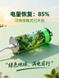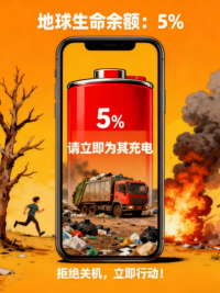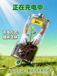 本作品以“地球-可充电电池”为核心隐喻,通过3幅递进式画面,诠释“绿色地球”的环保议题。《地球“电量”告急》:以5%低电的红色电池+荒芜的垃圾场、枯树场景,警示地球生态的危机状态;《以林为“电”:地球充电中》:借30%电量的透明电池+植树动作,将“环保行动”具象为“给地球充电”的过程;《绿能满格:地球重启生机》:用85%满电的绿色电池+雨林场景,呈现可持续发展带来的生态复苏。作品以大众熟悉的“设备电量”为载体,把抽象的环保议题转化为直观的视觉叙事,传递“个体行动可助力地球生机重启”的核心理念。