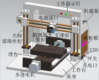 主要由床身、工作台、步进电机、USB数据传输口、光轴、滚珠丝杠、料盘架、散热器、电源插口、充电口、工作部分、工作指示灯、电箱等组成;