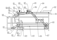 正反转滚筒组合式香蕉茎秆纤维提取机中,正向喂料装置、切片装置、挤压装置、夹持装置和正向刮杂装置置于机架的上层,1号集杂箱反向喂料装置和动力分配装置置于机架的中层,反向刮杂装置、叶片水泵、2号集杂箱、出料装置和电动机置于机架的下层,水箱置于最左端。