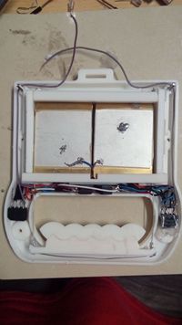 吊环长15cm,宽1.5cm,高10cm。表面为pom工程塑料,底边和两侧安装可pom 材料,塑料底部有压电元件。将压电材料黏贴在吊环底部和两侧,内部接两极压电的压电陶瓷元件,元件是10*1*0.1cm的矩形压电片,压电片有两个电极,分别由压电陶瓷和金属构成。