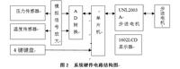 本系统由主控制器AT89S52及其附属电路、ULN2003A步进电机驱动模块、温度传感器模块、压力传感器模块、按键电路、显示电路、电源电路等部分组成。系统硬件框图如图2所示,