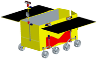 月球车为增加有效的载荷重量及安装空间,降低发射成本,车轮采用升降式车轮;由于要有30cm越障和<40º爬坡能力,所以车轮应为关节设计。因此,月球车机械机构设计包括: