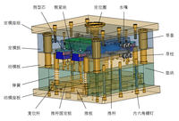 (4)脱模机构:由推杆、拉料杆、推杆固定板和推板等组成,保证表盘盖能够顺利从模具中脱出。