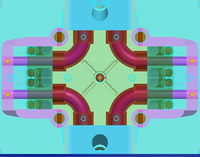 1、本设计采用了二级抽芯,一级抽芯是4个方向侧型芯抽的芯,二级抽芯是弯管的旋转抽芯,并采用了液压系统为旋转抽芯机构提供动力,液压缸体在模具板间,活塞杆向外顶,避免了常规抽芯机构造成的模具结构复杂,外形尺寸较大等。