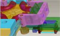 4、根据塑件的特征如侧孔进行侧向分型与斜导柱抽芯机构的设计,根据塑件的内部特征进行相应的顶出机构的设计,使塑件能够安全地顶出,产用小型液压缸加齿轮齿条的设计对弯管进行抽取,模具整体结构简单,生产效率高,标准件使用较多。