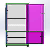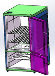 结构特征:产品主要由箱体、电力控制系统和冷热系统及附件组成。箱体由储冷室和储热室构成,采用环保材料3D打印直接制造。电力系统(太阳能板、蓄电池、控制器、控制器等)布置在箱体外部,冷热系统(半导体制冷片、热管、风机、翅片等)安置在冷室和热室之间。箱体的总尺寸350*410*630mm,热室内尺寸290*340*380,冷室内尺寸290*340*170,箱体的壁厚为30mm。