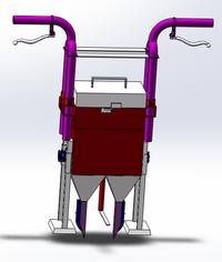 该实体名为手提式多功能播种机,是一种通过人工按压便可实现科学化播种的器械,更换不同的滚筒可实现蚕豆、豌豆、黄豆等种子的播种,并可实现一粒、两粒,三粒的需求,一机多用,灵活易变,功能强大。结合像云南一样地形复杂,农业生产小面积化,分散化的中国西南地区,设计小型轻便的机器,便于携带,使用方便的同时大大提高工作效率。针对云南土壤湿度大,粘度高的特点,做出了正常状态下按压挡板省力工作和特殊土壤情况下按压挡板和拉动拉伸手刹有效工作的机构,很好的实现不同状态土壤下的播种。该设计具有体积小,易携带,成本低,节能环保,性能稳定可靠,作业效率高等特点。结合人机工程学,其高度可调,改变了以往老播种形式下对腰部的伤害,使劳作变得轻松自然。整个机器结构简单,便于维护和修理,很适合老百姓使用。