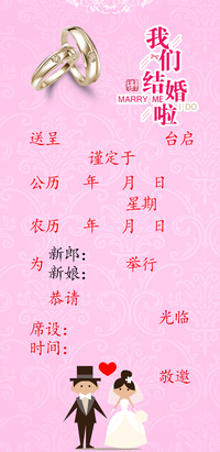 实习期间,参加了实习公司同事的两场婚礼,他们都有电子喜帖和纸质版的喜帖。根据我们中国的传统, 喜帖和中国古代的圣旨相结合制作成圣旨喜帖,古色古香,很有中国的味道。每场婚礼必不可少的就是喜帖了,又称为喜柬。在英语中称为Wedding Invitation。此邀请函上通常印结婚日期和典礼、婚宴举行时间,通常也会印上男女双方家长的名字。喜帖的寄出时间通常是婚礼前六周。