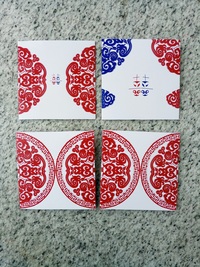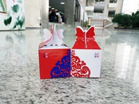 首先,根据东北少数民族赫哲族的图案元素再设计具有民族化意味的“囍”字,如图所示;设计相关花边纹样,如图所示;根据赫哲族记载的鸟纹饰图案重新设计喜鹊抽象图形单只,后期做对称图案,如图所示;根据婚装图案生命树、火纹、螺旋纹重新设计包装装饰的主体图形,如图所示。颜色上采用了婚礼主流色红色、萨满教象征善的白色、彩虹中的蓝色,现在婚庆用品的请柬上也开始有少数作品出现蓝色,做为红色的点缀,本人觉得这是一种设计趋势,也是婚庆产品中一种新的时代感的突破,值得设计师推敲与创新。