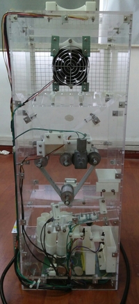 本产品通过投币口金属探测仪及红外传感器,再辅加于风机的配合,实现纸币和硬币分类;通过过减速直流电机与带挡板的同步带配合,并结合橡胶滚轴,实现硬币的逐个传送;基于滑道原理与根据不同硬币的尺寸大小而设计摇杆与直流电机的结合装置,实现对硬币的分类;用步进电机与旋转盘的配合,实现不同角度的旋转,而整理筒装配在旋转盘上,从而实现对硬币的整理;利用光电传感器,完成硬币的计数,并显示在数码管上。