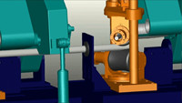 三个抛磨组件组合使用可一次完成棒料的粗磨、精磨至超精磨过程。工作过程中,棒料进入抛磨机后,进给部件3下移,棒料在两驱动辊旋转的摩擦力下向右进给。进给过程中棒料顺时针转动,在油缸5的作用下,砂带架带动砂带落下,压紧棒料。砂带在胶辊的驱动下顺时针转动,在棒料与砂带的切点处相对线速度为两者线速度之和。粗磨完成后,砂带架会抬起,精磨和超精磨工作重复上述过程。