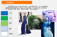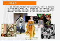 其灵感于蝴蝶。蝴蝶以其身美、形美、色美、情美被人们欣赏,历代咏诵。蝴蝶是最美丽的昆虫,被人们誉为“会飞的花朵”、“虫国的佳丽”,是一种高雅文化的象征,可令人体会的回归大自然的赏心悦目。蝴蝶是幸福、爱情的象征,它能给人以鼓舞、陶醉和向往。对这个主题,通过主题板的形式传递主题概念、色彩概念、面料概念、廓形概念、设计细节和搭配方式等概念。