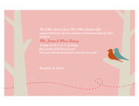 该主题婚礼系列设计作品中主要包含了对婚礼主题logo、婚礼请柬、吊牌、婚礼场景的设计。以一对鸟儿相见-相恋-相守的爱情故事为主线,设计了整个婚礼系列。配色上使用了淡粉色、淡黄色、红色及粉绿色,给人一种浪漫、温馨、自然的感觉。设计元素包含一对鸟儿、树木、花朵,充满着美好与自然。