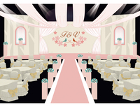 婚礼的场景布置以淡黄色、粉红色为主基调,舞台整个造型为T字型,天花板上的幔布一直向舞台前方延伸,两侧追光也向舞台中央聚龙,更易使宾客将注意力集中在舞台之上。长廊两侧用花束进行装饰,是婚礼场景的整体布置上给人一种生机与美好的感觉。