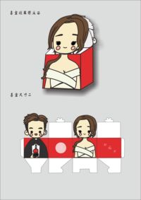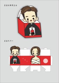 我采用新郎和新娘两个卡通人物作为喜帖和喜盒的主要元素,增添了喜帖喜盒的趣味性。喜盒喜帖整体以红色作为主题色,代表了吉祥,喜庆,幸福,温暖的意义。请柬分别用新郎新娘的半张脸组成,请柬合起来两张脸就组合在一起,喜盒的正反两面是不同的,一面是男生,一面是女生,盒身是身体的图案,盒盖是头部的图案,新郎和新娘头部依靠在一起,代表以后两个人就要互相依靠,共同成长,共同撑起一个幸福美满的家。