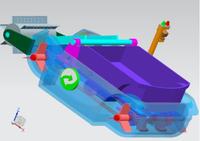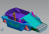 船体前方带挡板的滚筒旋转时,将垃圾一并卷起,并暂时存放在前方的斜板末端。斜板底下的压力传感器测得待垃圾重量足够时,产生信号传递给核心处理器,切断滚筒电机的电源,并驱动板下的液压杆,由液压机构,将斜板抬起一定角度,使垃圾滑入船上的垃圾箱内。当垃圾收集满后,船体内置的蜂鸣器鸣响,同时船上的信号灯闪烁,提醒超载。