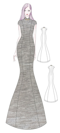 生活和大自然给我们带来了许多的感动。此系列作品的灵感来源于大海,水的灵动予人以智慧,海的博大予人以宽容,在此系列的款式设计中,我们趋向于这两种特性,用灵动的线条来修饰上身的剪裁,用夸大的波纹来装点裙尾,而且面料也是采用带有金丝的纹路来体现出阳光下水面的波光粼粼。注重线条的流线性,烘托东方女性之美。线在服装中的表现不仅是一个中介作用,同时它也是服装的“中 场灵魂”,聚合成线,转而通过各种形式构成面,既丰富了服装设计,也使其变得更有意蕴与生命力。从旗袍的演变发展中能够发现演变遵循的规律:自身的演变和社会时代的制约。这也是整个服装演变的基本规律。对现代旗袍进行了定义和分类,提出了现代旗袍创新设计的原则,在遵循形式美法则的基础上,采用移用、分割等设计方法对现代旗袍的整体造型与局部结构进行了创新设计与分析,探讨了如何在保留传统旗袍精髓的基础上对现代旗袍进行突破与创新,如何运用现代创新设计方法设计出新颖、现代的旗袍样式等问题。