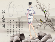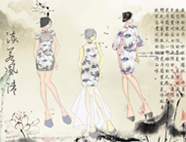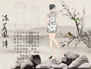 旗袍突出展示的是女性的柔美,本系列的服装采用淡紫色花纹图案面料表现女性的恬静淡雅,淡雅的花卉图案给人一种婉约的风格,娇柔精致而毫不张扬的花卉图案完美体现着服装高贵优雅的独特品味。不仅能够唤醒女性纯净无暇极致优雅的脱俗气质,更能彰显出与众不同的非凡品位。在此基础上加上纱质面料的运用,展现女性朦胧美,吸引人去探探究竟。款式在传统旗袍的基础上进行了一定的改良,使之更符合新时代女性的审美要求。在人体的胸部以上运用纱质面料,女性美丽的锁骨隐约可见。在服装的大腿以下附上两层纱至脚踝处,女性苗条的腿部依稀可见。也有在服装的肩部加入斗篷造型,风吹起来,就如女性摇曳着的身姿。
