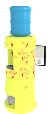 机身采用组合式结构,中线设滚轴,机身一侧为饮水机,另一侧为微型冰箱和消毒柜,机身上下部分可相对旋转;消毒柜采用紫外消毒,柜门可推拉;整机结构简单,锥瓶设计,稳定性好,操作方便,既是艺术品,又是家电产品,集饮水机、冰箱、消毒柜等功能于一体,空间利用率高,可用于办公室、家居客厅、厨房等场所,有较好的市场前景。