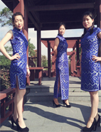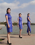 此系列延续古典旗袍,进行局部改造,采用古典元素图案花纹来增加亮点,面料为蓝色印花面料,色彩方面采用蓝色基调,蓝色本身就给人高贵、大方的感觉。包边采用两层,包边条的色彩采用蓝色加银灰色,,并用蓝色盘扣加以装饰及固定,设计点在于领部及门襟处的线条设计,款式长短搭配,整体系列体现女性柔美中又略带性感的感觉。