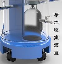 使用说明:白天将此装置放于室外,一是收集空气中的水蒸气,二是收集太阳能产生的电能,将污水倒入入水口,净化污水,污水净化完毕后打开水龙头即可获得纯净水。