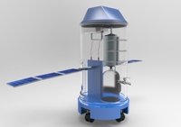 设计原理:此产品的结构说明如下,顶部有通风口和冷凝装置,冷凝装置采用冷热交换器进行液化空气含有的水蒸气,植物夜间呼吸作用产生的水,中间有过滤净化装置,净化化装置首先是物理净化,第一层净化采用一个直径150mm厚度5mm的圆形铁纱网,外层包裹一层PP棉,主要过滤泥沙、铁锈、粉尘以及大于5微米的的一切杂质,铁砂网内层采用不绢布(净化布),第一层与第二层铁纱网之间放入石英砂与2mm的细小陶瓷颗粒;第二层铁纱网与第一层一样,上层采用PP棉,下层仍采用不绢布(净化布),然后第二层铁纱网与第三层铁纱网中间放置微型压缩式活性炭,用来吸收水中异味、气状污染物(包括硫氧化物勺一氧化碳、氮氧化物、碳氢化合物)、余氯、嗅味、异色和胶体等小分子杂质;第四层采用RO反渗透膜和超膜进行过滤,此过程为对水的精滤,其过滤精度最高,在0.0001微米,只允许水分子和溶解氧通过,对水中所含杂质如化学药品N、P、S等的氧化物、细菌、病毒、重金属离子等有害物质几乎全部被截留排除,且保证对人体有益的钾纳盐等微量元素,保证人体健康过滤净化装置下有净水收集装置,外壳上装有太阳能电池板,是为冷凝装置提供电力,底座装有可折叠式万向轮,方便携带。