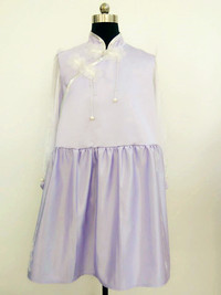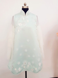 设计构思:甜美的鲜花搭配马卡龙色系与轻盈的薄纱,尽显梦幻的意境。旗袍元素与礼服相结合,中西合璧,满足现代人的穿衣需求。服装运用大A廓形,穿戴更加舒适。