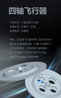 外观机身设计采用了3D打印技术制成的光滑曲面机身。这样不管飞行器的飞行方向是哪边,所受的阻力都是最小的,而且机身下方有四只脚,可以保证其在平行地面能平稳的停住。