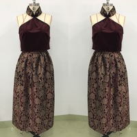 款式说明:1.主要是领部结构的设计。2.盘扣使用琵琶扣。3.将中式旗袍与西式礼服裙结合。4.使用面料再造与拼接。