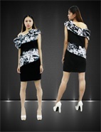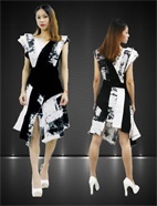 第一件衣服,我们主要采用的是面面的拼接。在下摆拼接处留一小段,这样下摆会随着穿着者的走动有飘逸的感觉,长短不一的设计也有若隐若现的美。第二件衣服,端庄大气,一字领的设计能完美展现女性锁骨到肩部柔美的特点。第三件衣服的亮点在斜肩上花型的塑造,在花的中间我们用点的元素加之点缀,使服装变得丰富。第四件衣服款式简洁,没有复杂的结构,用面料不规则的拼接形成错落感,左右不对称给人视觉上的冲击。第五件衣服,在肩部加了一个小披风,两边披风一黑一白,形成对比。裙摆前长后短并成波浪状,肩部和下摆的波浪给人一种灵动、活泼的感觉。