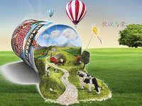 第一主要是选一个合适的背景,而我选择了一个宽阔的草原的背景图,对于这幅图我主要是用了剪切,将草原进行了适当的调整;然后就是新建一个图层,置入第二素材,表达奶粉的质量,运动工具栏里的模糊工具,将奶粉罐的周围模糊;再建一个图层,置入第三个素材,将热气球用多边形套索工具选取移至上一图层,ctrl+t选定,shift缩小,放于适当的位置,表达希望假冒的商品可以随风而去,远离人们的生活,像热气球一样;新建图层后运用文字工具,写上这个作品的主题,然后简单的运用渐变工具。