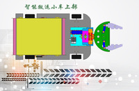小车主要由车身、码垛装卸一体化装置及控制系统等部分组成。车身采用电机驱动,有高中低三种速度,通过差速控制小车的转弯,实现小车各个方位的运动。码垛装卸一体化装置,由夹持器、门架、转盘、电机、传送带等组成。装有力传感器的夹持器,既可实现智能夹取,又可实现码垛,还能沿门架上下运动,方便、快捷;通过转盘可实现夹持器及门架的旋转,可将物品精准装加到车身上;传送带装置可实现车身存取空间的充分利用,实现最大装载,增大搬运效率。