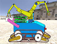 结构说明。多功能搜救机器人主要有机身部分、驱动部分、机械臂组成。机身采用“双层机身+可活动食物箱”式设计,装载有运动、控制模块。上层机身装有双摄像头,观察前进方向以及四周的废墟情况,传输废墟的实时影像;下层机身主要盛载动力输出系统,传动系统,转向系统和制动系统。机械手由液压系统控制,功能为辅助机器人前行、抓取食物、辅助探测等。机器人采用“主履带+副履带”驱动方式,有平地行走、废墟行走两种状态。